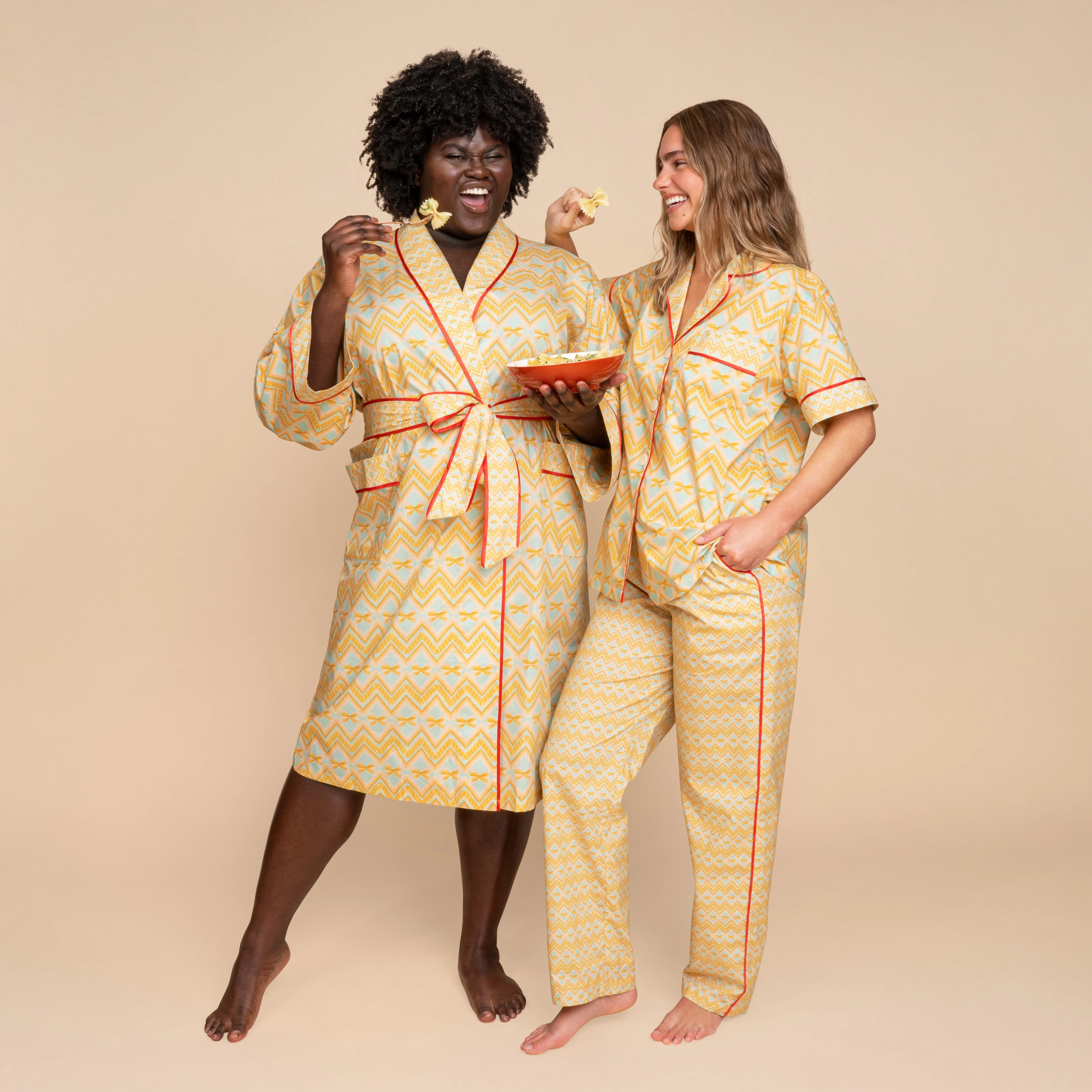 Get im-pasta-bly cozy in this comfy cotton robe! The cute pasta print (farfalle and fusilli to be exact) on this long-sleeve robe is the perfect pairing for your next dinner-in-bed weeknight dinner. Pair it with the matching PJs for the ultimate noodlinâ around fit.